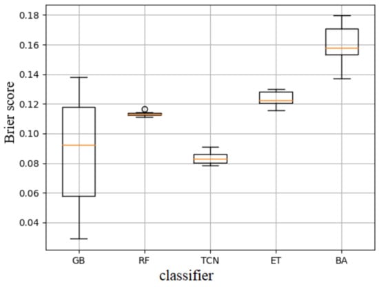 We compared performances of four classical machine learning classification algorithms which are Random Forest (RF), Gradient-Boosting tree (GB), Extra tree (ET) and Bagging methods (BA) with the proposed TCN model using the VPN-nonVPN dataset with the Brier scores in Figure 8. The Brier score (vertical axis in Figure 8) measures the accuracy of a probability forecast ranging from 0 to 1. , where is the forecast probability, is the outcome. The score of 0 stands for complete accuracy and 1 means the forecast was totally inaccurate. The results were illustrated using box-plot from which we concluded TCN model outperformed the others. Although GB method might perform better than TCN in some cases, the mean and the range of the scores was below the TCN model.