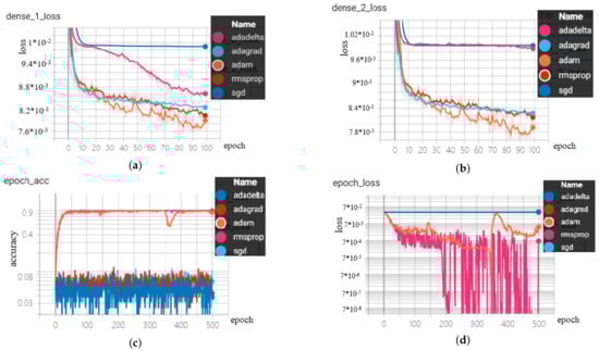 Activation function of “Sigmoid” and “Tanh” were used in the basic LSTM cells (see Equation (1)). The basic function might suffer from computational underflow (the value of numerator was very small) or overflow (the value of denominator was approaching zero). We proposed using the following equation The value of denominator was at least more than and the numerator becomes larger so this problem was avoided. The optimizers selection influenced the training processes and the results, so five candidate optimizers were tested to find the most suitable one for the proposed models and dataset. Performances of losses, mean squared error rate and the training time were reported.