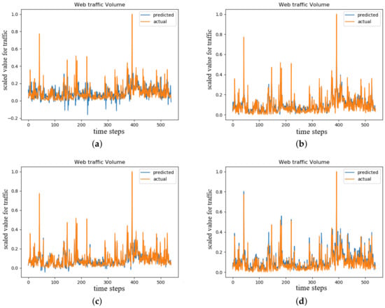 Public datasets were collected for the proposed models. Kaggle web traffic competition was used for the time series forecasting task []. We evaluated the performance of the proposed LSTM, TCN and GAN models using this dataset. ECG, a multivariate and classified dataset, was used to test the performance of time series classification task with the TCN model. The dataset has 19 features, 150 time steps and 20 classes—that is, 19 features were collected for 150 time steps and they were classified into 20 classes. The VPN-nonVPN dataset from the Canadian Institute of Cybersecurity was used for time series classification, which can be found at [].