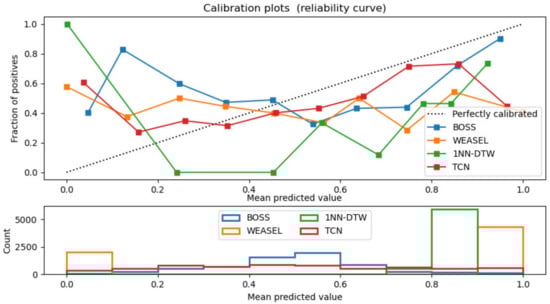 Models calibration comparisons among 1DNN-DTW, BOSS, WEASEL and TCN.