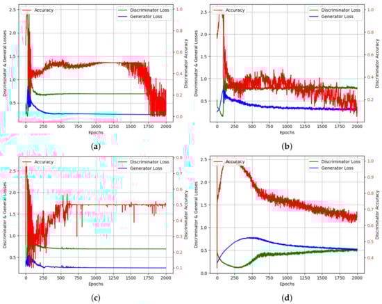 This finding confirmed that training processes of GAN sometimes cannot converge to the satisfying minimum. Carefully choosing optimizers such as “Adam” and fine-tuned the corresponding parameters, the accuracy of discriminator converged to the minimum (see Figure 14).