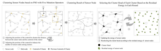 It can be noticed from the figure that while both PSO-FMO and SPSO group the sensor nodes scattered into clusters in the sensing region R. However, the allocation of cluster centroids by SPSO is not reasonable. For example, the clusters highlighted by circles have extremely asymmetrical centroids, which results in an increased distance between sensor nodes and their centroids and thus a deceased fitness . Furthermore, the result of SPSO also shows the imbalance of the number of sensor nodes between clusters, which is shown in the clusters highlighted by square. These results indicate the weak performance of SPSO, the method that does not use the five mutation operators in optimizing sensor node clustering. In contrast, PSO-FMO achieves more reasonable cluster centroids and a better balance of the number of sensor nodes between clusters. This is because the use of five mutation operators increases the search diversity, thus improving the probability of finding a better sensor node clustering solution. Therefore, the use of PSO-FMO justifies the good performance of EBCRP in optimizing sensor node clustering.