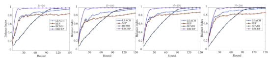 To further verify the balance of energy consumption between sensor nodes in EBCRP, the energy consumption balance index (ECBI) is calculated based on the fairness index as shown in Equation (
