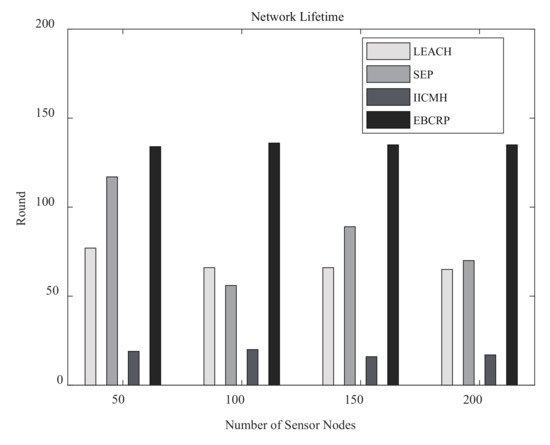 To fully compare the performance of each method, simulations were performed for four different numbers of sensor nodes: 50, 100, 150 and 200. For LEACH and SEP, 5% of sensor nodes were selected as CHs. For the IICMH and EBCRP methods, 5% of sensor nodes are set as the expected number of clusters and a maximum number of clusters, respectively.