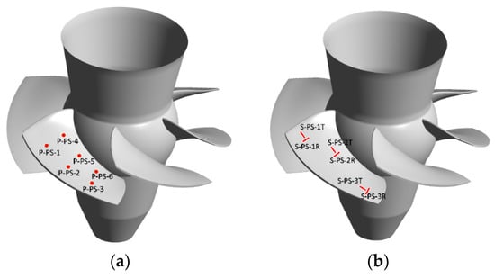 The time-averaged strain variation on the blade obtained from four strain gages during the steady-state operating conditions is presented in Figure 6. A high strain is observed close to the blade hub compared to other locations. Similar to the relatively high-pressure magnitude at OP0, the strain magnitude is also higher compared to other operating conditions. The variation of the strain on the blade in the radial and tangential direction for each propeller curve is different. This shows that the discharge is not the only parameter affecting the strain on the blade.