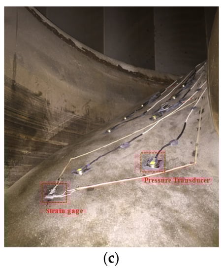 (a) Position of the pressure transducers on the runner blade pressure side [], (b) position of the strain gages on the runner blade pressure side [], (c) the blade runner pressure side before applying the epoxy.