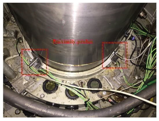 The lateral displacement of the shaft was measured by two proximity probes (DW-AD-509-M12 manufactured by Contrinex) installed close to the turbine guide bearing with a 90° spacing. The sensing range was 0–6 mm. Figure 3 shows the location of the proximity probes installed close to the turbine guide bearing.