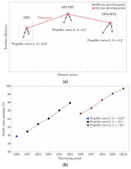 The experimental investigation of the turbine was performed at eleven steady-state operating points selected from three propeller curves. Figure 4a presents a schematic of the operating points. The on-cam operating points (OP0, OP3, and OP8), located on the cam-curve (red color) highlighted by the blue dashed-line box, are considered the BEP of the first, second, and third propeller curve, respectively. Looking at the turbine on-cam operation, OP0, OP3, and OP8 are considered as deep part load, BEP, and high-load operating points, respectively. Moreover, eight off-cam operating points were selected from two propeller curves (propeller curve-2 and propeller curve-3) covering part load and high load operation of the unit while operating in off-cam mode. Figure 4b presents the guide vane opening of the investigated operating points. The runner blades pitch angle of the first, second, and third propeller curves is −14.3°, −3.5°, and +4.5°, respectively.