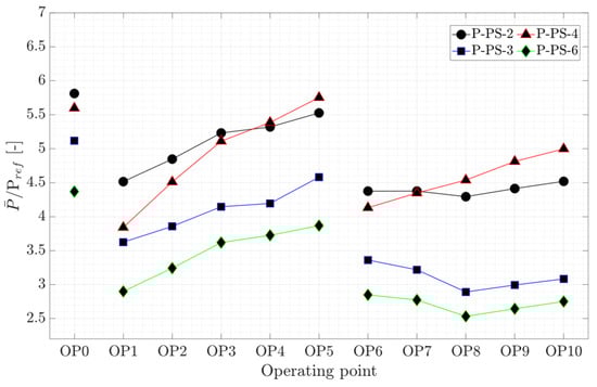 In this study, the pressure data is normalized with respect to the initial pressure value in the turbine chamber before running the measurement (). The normalized time-averaged pressure variation on the runner blade pressure side for OP0–OP10 is presented in Figure 5. The pressure increases for all the pressure transducers for the operating points OP1 to OP5 (propeller curve-2) as the discharge increases with the guide vanes opening. In the propeller curve-3, similar increasing behavior is observed for the pressure transducer located at the leading edge close to the runner hub (P-PS-4) from OP6 to OP10. However, the pressure magnitude of the other pressure transducers shows a minimum value at OP8, which is considered as the BEP of the propeller curve-3. Despite the lower guide vane opening at OP0, the pressure magnitudes are higher than at other operating points due to the nearly closed runner blades position.