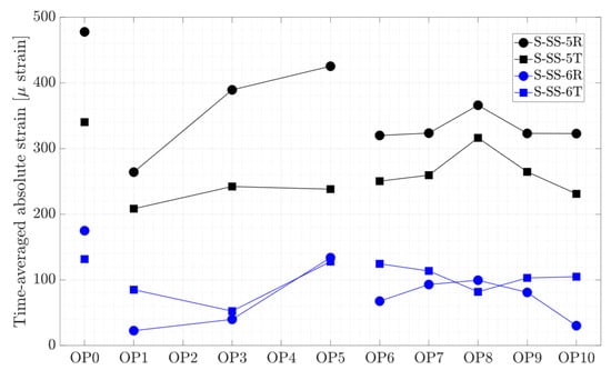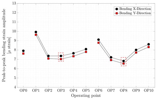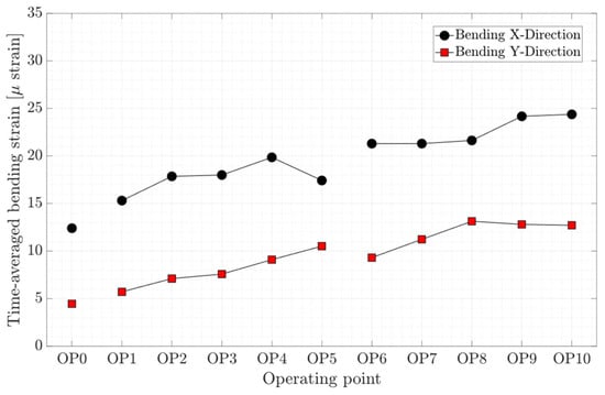 Time-averaged bending strain obtained on the shaft at OP0–OP10.