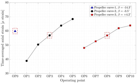 Time-averaged axial strain obtained on the shaft at OP0–OP10; red dashed-line boxes indicate the on-cam operating points.