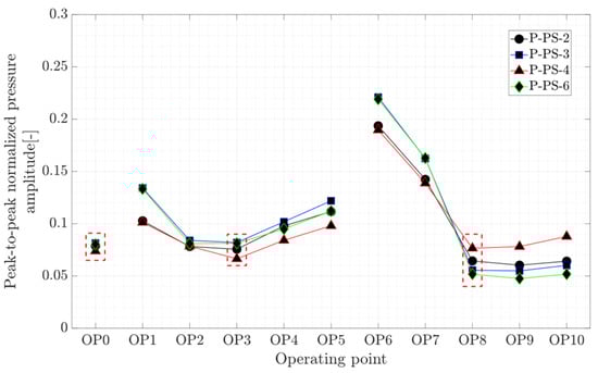Peak-to-peak normalized pressure amplitude of four pressure transducers on the runner blade at OP0–OP10; red dashed-line boxes indicate the on-cam operating points.