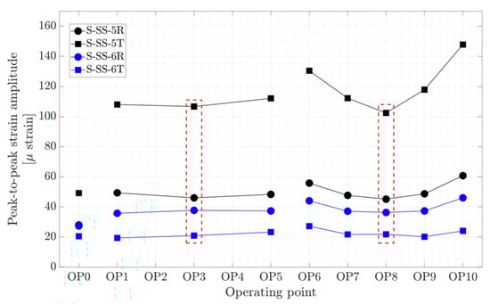 Peak-to-peak amplitude of axial strain obtained on the shaft at OP0–OP10 red dashed-line boxes indicate the on-cam operating points.