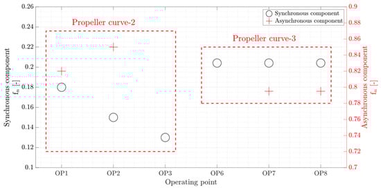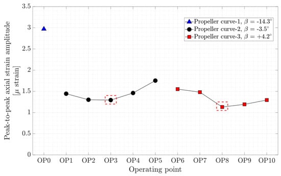 The axial, torsion, and bending peak-to-peak strain amplitude at different operating points are presented in Figure 12, Figure 13, and Figure 14, respectively. Local minimums are observed in the figures for each propeller curve occurring at OP3 and OP8. This result shows that the operating points that have minimum peak-to-peak strain amplitude on the shaft and peak-to-peak pressure and strain amplitude on the blade are identical. Despite a similar axial strain magnitude at OP0, OP3, and OP8, the peak-to-peak axial strain amplitude at OP0 is relatively large compare to other operating points. OP0 correspond to a deep part load where the guide vane opening is small. A high swirl is generated that may cause instability leading to axial flow movement. Later in the spectral analysis, the presence of a dominant low-frequency asynchronous mode is detected at this operating point.