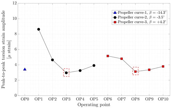 Peak-to-peak amplitude of torsion strain obtained on the shaft at OP0–OP10; red dashed-line boxes indicate the on-cam operating points.