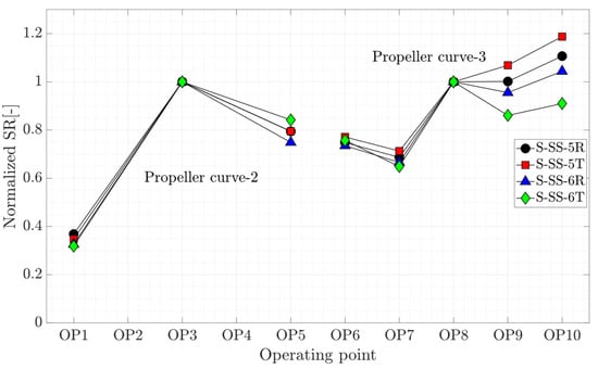 where is the peak-to-peak strain amplitude. The subscript blade and torsion denote the strain gage on the blade and torsion strain gage on the shaft, respectively. This number is used to assess the ratio of peak-to-peak strain amplitude obtained on the runner blade and torsion strain obtained on the shaft. Figure 15 presents the SR number variation normalized by the SR value of the propeller curve’s BEP for four strain gages installed on the runner blade. Although a different trend is observed for each propeller curve, the SR variation of four strain gages is similar except for OP9 and OP10, which are high load operations. This shows that the ratio of peak-to-peak strain amplitude on the runner blade at two different locations for different operating points is similar.