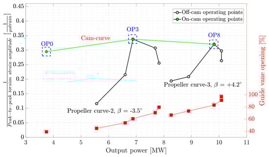 Besides the strain correlation between the blade and shaft measurements, torsion measurement on the shaft showed to be a potential candidate for index-testing in Kaplan turbines. Figure 16 presents the variation of the inverse of the peak-to-peak torsion strain amplitude obtained on the shaft as a function of turbine output power. The right axis of the figure shows the variation of the guide vane opening. A hypothetical line specified by a green color represents the cam-curve. The operating points specified with the blue dashed-line boxes are assumed to be the BEP of the propeller curves and gray circles show the off-cam operating points. A local maximum is observed for each propeller curve representing the BEP of the propeller curve.