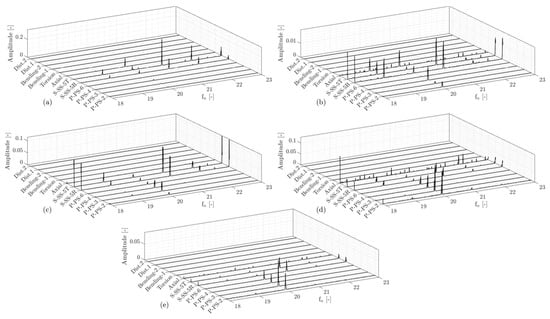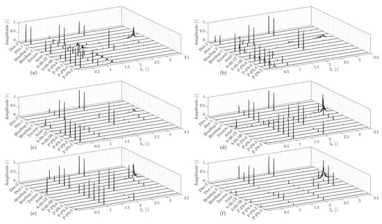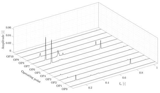 The amplitude spectra of the operating points on the propeller curve-3 (OP6-OP10) in the high-frequency region is presented in Figure 18. Guide vane passing frequency () is observed in the pressure and strain data obtained on the blade. However, it is only detected in the axial strain measurements on the shaft. This proves that a signature of every phenomenon observed in the data obtained on the runner can also be captured in the data on the shaft.