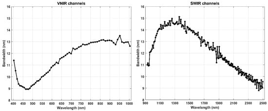 The PRISMA satellite, launched on 22 March 2019, holds a hyperspectral and panchromatic payload which is able to acquire images with a worldwide coverage [35]. The hyperspectral camera works in the spectral range of 0.4–2.5 µm, with 66 and 173 channels in the VNIR (Visible and Near InfraRed) and SWIR (Short-Wave InfraRed) regions, respectively. The average spectral resolution is less than 10 nm on the entire range with an accuracy of ±0.1 nm. VNIR and SWIR channels are overlapped between 930 and 1000 nm and the FWHM (Full Width at Half Maximum) is in the range of 9–15 nm (see Figure 3).