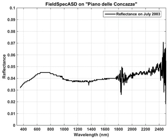 The reflectance spectrum, in the range of 0.4–2.5 µm, was acquired with a field spectroradiometer (Fieldspec ASD) during a measurement campaign at the PdC site in July 2003. This instrument has a spectral resolution of 3 nm at 700 nm and 10 nm at 1400–2100 nm and a sampling step of 1.4 nm at 350–1050 nm and 2 nm at 1000–2500 nm. During the field campaign of July 2003, measurements of surface reflectance were collected between 10:00 and 12:00 (local time), synchronous with Hyperion acquisition [23]. In Figure 4, the reflectance measured at ‘PdC’, characterized by very low values in the range 0.03–0.05, shows the presence of fine tephra and ash deposits.