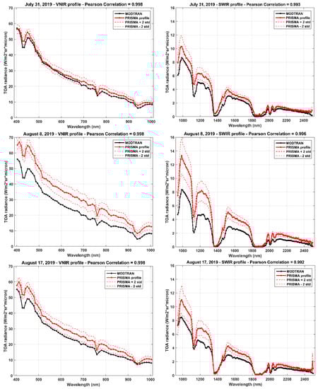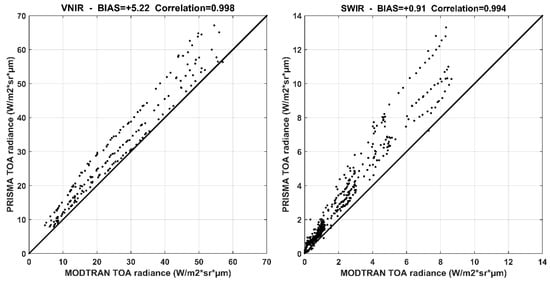 The Pearson correlation coefficient is equal to 0.998 and 0.994 for the VNIR and SWIR spectral ranges, respectively. Moreover, PRISMA TOA radiance overestimates model values for all three days of measurements (see scatter plots of comparisons in Figure 6).