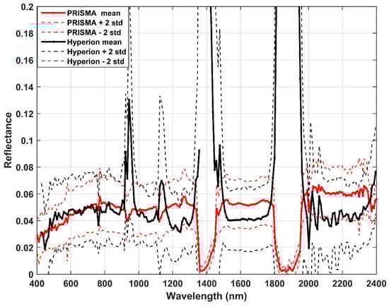 Reflectance values estimated by PRISMA for the three dates are compared with past measurements by Hyperion in the period 2001–2009. Specifically, the PRISMA mean values are obtained from the average of the three acquisitions, and the standard deviation is also calculated and reported. The comparison results show an overestimation of PRISMA values which are included in the interval of ±2 standard deviation, representing the variability of Hyperion values. Figure 7 shows four picks at 941, 1137, 1415 and 1875 nm due to the water absorptions not completely compensated in Hyperion images.