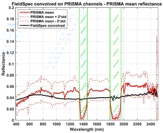 Reflectance profiles of PRISMA (red) and FieldSpec (black).