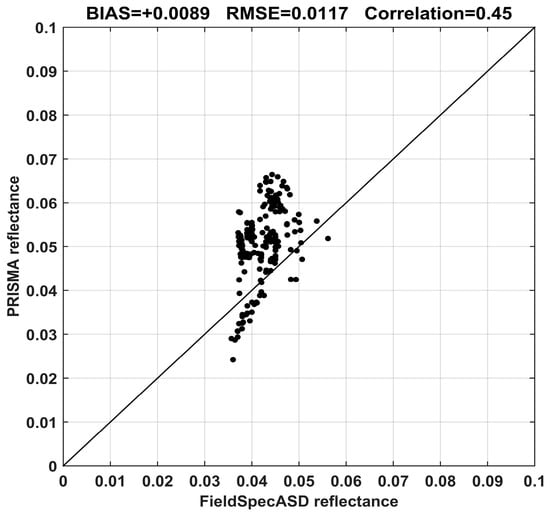 Scatter plot of PRISMA and FieldSpec reflectance values.