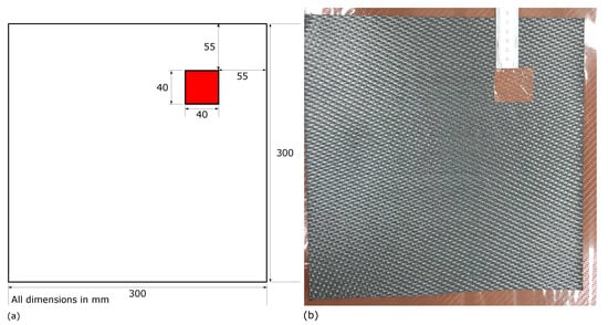A CFRP sample laminate of 300 × 300 mm in size was created from bi-axial CFRP 5 harness ply with density 1589 kg m; two plies were laid up with orientation 0/90/0/90, 0/90/0/90 to produce non-symmetrical and balanced laminate samples of 0.7366 mm in thickness.Creation of a delamination within the sample was achieved through the insertion of two Polytetrafluoroethylene (PTFE) squares 40 × 40 mm, of 0.01 mm thickness between the ply boundary of the two plies of the laminate sample at the top and right edges 55 mm from the top and right hand edges (Figure 1). The Sample was cured within Collins Aerospace’s Nitrogen pressurised Autoclave at 180 C for 2 h at 35 psi. The cured samples were inspected via the tap testing method by an experienced aerospace engineer in order to ensure that a delamination had occurred. As the sample was the 8th defect variation type within a larger body of work, and in order to maintain the naming convention with the associated published data set it was assigned the label “D8” so as to allow the identification of the corresponding open data sets.