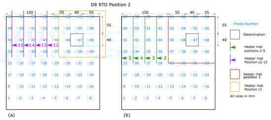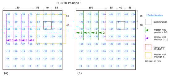 RTD position 1 (Figure 3) represents the RTD array positioned centrally on the sample with an edge distance around the RTD array of 18.75 mm. The delamination is directly under 4 RTD probes, 46, 47, 54 and 55 at this RTD array position. As shown in Figure 3b a 150 × 150 mm heater mat is located in the top right quadrant of sample D8 and is applied to the opposite surface of the sample to that of the RTD array. The initial position (Heater mat position 1) matches the distance of the centre of the heater mat to the centre of the delamination. A further four heater mat positions are created for testing, shown in green, with a relocation of the heater mat in 37.5 mm increments towards the left hand edge of sample D8, yielding five unique data capture conditions. Using the same spacing between the five heater mat locations but altering the initial position by −18.75 mm in the y-axis and +18.75 mm in x-axis (Figure 3b) provides another five data capture conditions.