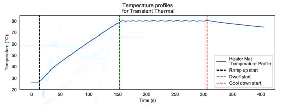 Temperature against time profiles were captured and labelled according to RTD locations relative to the heater mat location and sensor positions over a delamination. In order to minimise the risk of expansion to the manufactured delamination, or the creation of new defects due to thermal cyclic loading [16,17], a low energy, low temperature (maximum 80 C) heating profile was applied. The low temperature stimulus was segmented into three distinct phases: Ramp up; Dwell; and Cool down (Figure 5) over periods of 140 s, Ramp up; 160 s, Dwell; and 90 s Cool down respectively. Sample D8 was heated using the stepped heating profile at each of the heater mat locations and RTD array positions.