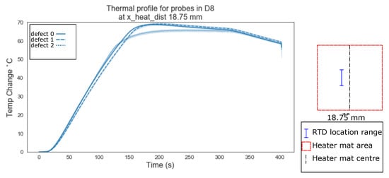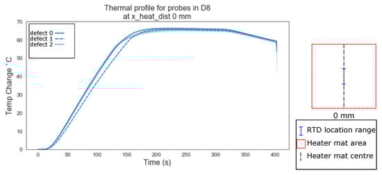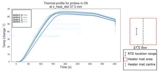 A more consistent profile appears to emerge between the defect types ‘1’ and ‘2’ during the ramp period at the RTD distance from the centre of the heater mat of 56.25–18.75 mm from the edge of the heater mat-(Figure 9). A clearly visible reduction in the ramp rate is evident when compared to homogeneous regions ‘0’ and homogeneous regions where a defect exists in the path between the centre of the heater mat and RTD (defect type ‘3’).