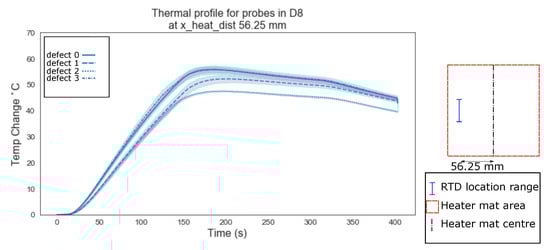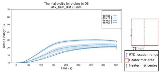 The distinction in temperature profile becomes more apparent at 75 mm from the centre of the heater mat (Figure 10), at which point the RTDs are located on the boundary area of the heater mat and the unheated areas. The interaction between the heated area and unheated area is at its most obvious due to the structural dissipation of the thermal energy origination from the heater mat being drawn into the unheated sample at this sample evaluation configuration. A distinct mean temperature profile is evident when compared to the homogeneous regions (defect ‘0’), homogeneous regions impacted by a delamination in the transmission path to the centre of the heater mat (defect ‘3’) and the presence of delaminations (defects ‘1’ and ‘2’).