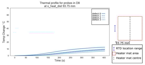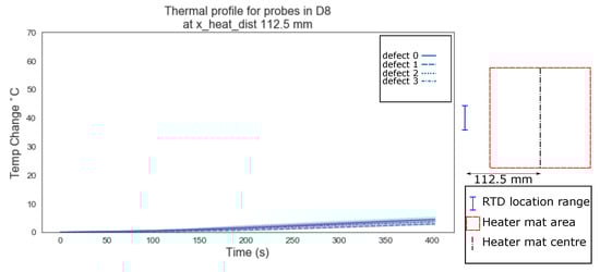 Evident from Figure 6, Figure 7, Figure 8, Figure 9, Figure 10, Figure 11 and Figure 12 is that the thermal profiles produced by probes situated centrally to the heater mat (37.5 mm and under) display less obvious variation in both ramp rate and maximum temperature regardless of defect type. Although the impact on the transient thermal conduction due to structural dissipation can be seen (56.25 to 93.75 mm), a reduction to the overall ramp rate and maximum temperature reached is evident only in the instance of delaminations directly below the RTD probe or to a lesser extent when the delamination exists between the probe and centre of the heater mat. In the case of the three RTD x-axis distances which produce visual distinctions between homogeneous and delaminations temperature profiles, these distinctions are most apparent within the 140 s ramp section of the heating profile (20 s–160 s); the resultant temperature profiles for each of these three RTD distances appear to be straight lines.