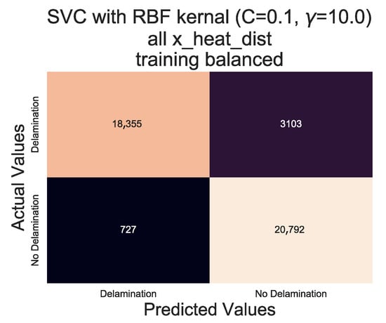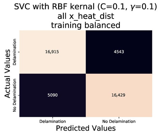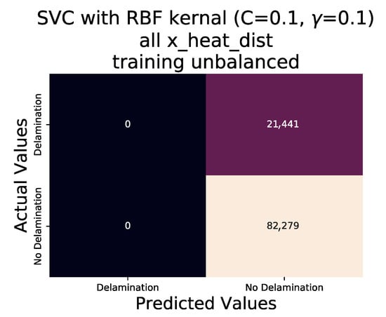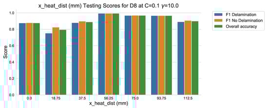 The overall accuracy and F1-scores can be plotted to identify the ‘’ value that results in the best performance through training the SVC algorithm with incremental increases in ‘’. Figure 15 displays the F1 scores for ‘Delamination’ and ‘No Delamination’ as well as overall accuracy of the test samples within the training data set of sample D8. Inspection of the bar plot indicates that the highest performance is achieved for the ‘’ value 10.0 at ‘C’ = 0.1. Table 5 presents the resulting F1 score of 0.905 (90.5%) for ‘Delamination’, F1 score of 0.915 (91.5%) and an overall accuracy of 0.91 (91%). Although an accuracy of 100% is ideal, it is also a strong inference of algorithm over-fitting to the training data set [27,28].