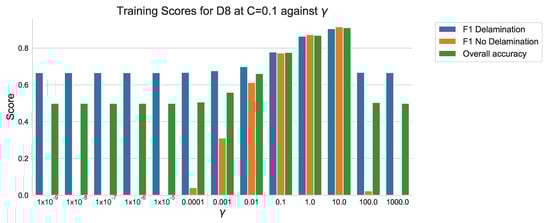 F1 scores and overall accuracy of sample D8 within training data set using SVM algorithms with RBF kernel, C = 0.1 values against .