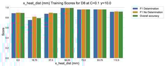 The hypothesis regarding the performance of the algorithm trained on the balanced data set is that it is impacted by the similarities in temperature against time profiles of RTD positions 0 mm, 18.75 mm and 37.5 mm for both all types of ‘defect’ (Figure 6, Figure 7 and Figure 8). As discussed previously, a consistent difference is only apparent at the RTD positions in which the structural dissipation of transient thermal conduction appears within the temperature against time profiles of 56.25 mm and over (Figure 9, Figure 10, Figure 11 and Figure 12). The impact of structural dissipation of transient thermal conduction on the performance of the algorithm was investigated further through the testing of each unique ‘x_heat_dist’ within the algorithm trained on the balanced data set. Separation of the test values from the balanced data set by ‘x_heat_dist’ yields unique ‘x_heat_dist’ groups and the performance of each can be assessed from the classification scores recorded within each unique report. Figure 17 displays the F1 scores for ‘Delamination’ and ’No Delamination as well as the overall accuracy for the SVC algorithm when scored with the test data set from each unique ‘x_heat_dist’.