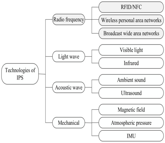 Many representative technologies have been employed to develop IPS. The technologies can be categorized into RF, lightwave, acoustic wave, and mechanical, as shown in Figure 1.