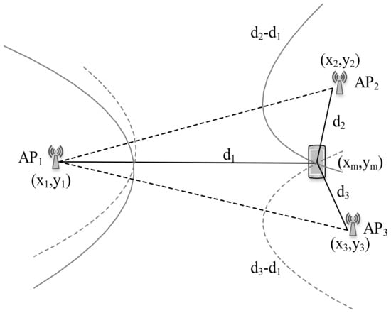 For TDOA measurement, the difference in arrival time from multiple APs is employed. In TDOA based localization, the distance difference between the tag device and APs is calculated based on time difference measurements as shown in Figure 3.