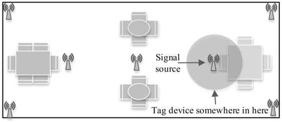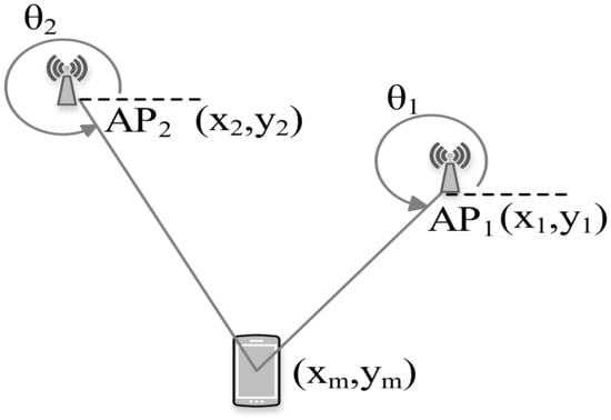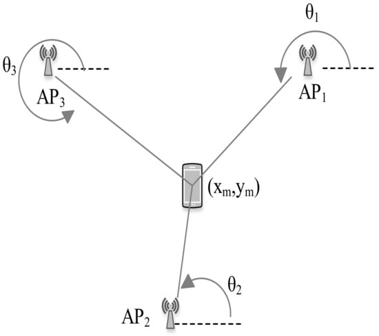 The AOA information is extracted employing the directionally sensitive antennas [89]. The AOA measurement determines the direction of propagation of a radio wave incident on an antenna array. It can be done by measuring the TDOA at individual elements of the antenna array [92]. AOA-based localization system estimates the location of the tag device as the intersection point of pairs of hypothetical signal paths particular angles as shown in Figure 4.