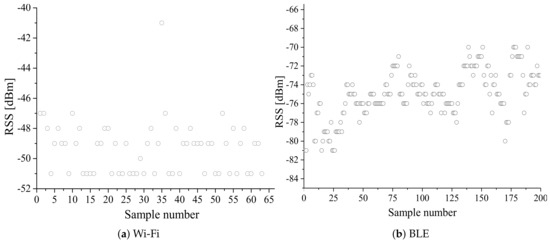 Moreover, a Wi-Fi module usually requires 3–4 s to process the command from the positioning app to acquire a new scan result [57]. In practice, repeated RSS data are acquired until new scan results are produced to perform sampling per second in Wi-Fi AP. In such a case, subsequent filtering must be performed on the obtained Wi-Fi data to remove the erroneous statistical analysis.