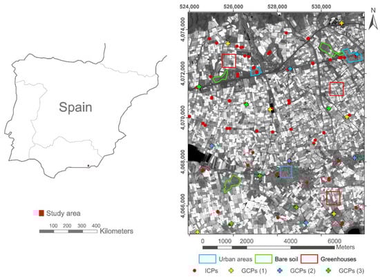 Location of the study area in Almeria (Spain). The nine selected subareas representing urban areas, bare soil and plastic covered greenhouses are depicted in blue, green and red polygons, respectively. Independent check points (ICPs) are represented with red points, while ground control points (GCPs) appear as crosses (six in green, six in blue and six in yellow). Coordinate system: WGS84 UTM zone 30N.