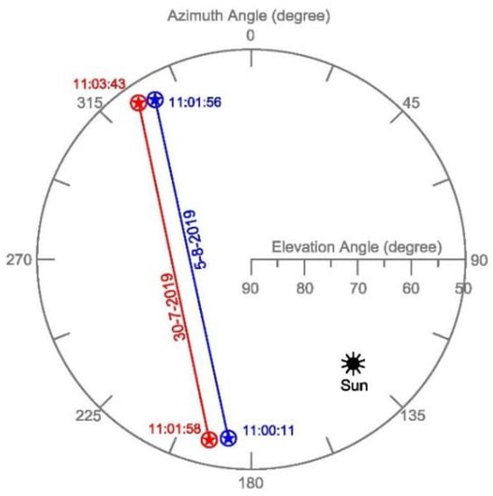 Sky plot with satellite azimuth and elevation angles at the time of acquisition for the two Deimos-2 stereo pairs.