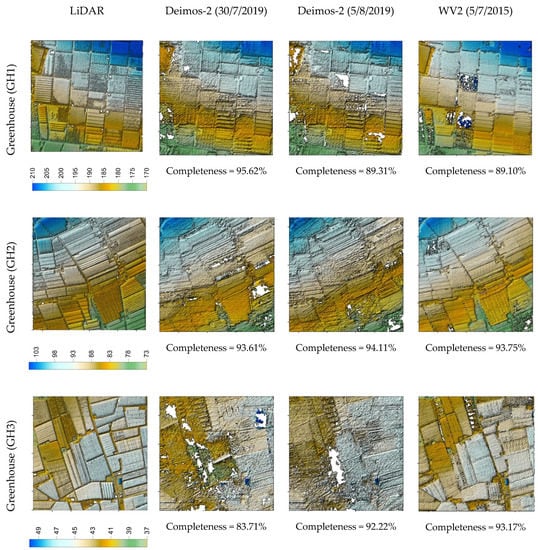 Digital surface models (DSMs) and completeness values corresponding to the three subareas of plastic covered greenhouse land cover (GH1, GH2 and GH3) generated from the first and second Deimos-2 stereo pairs (second and third column) and the WV2 stereo pair (fourth column). The reference LiDAR is depicted in the first column.