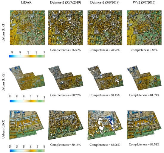 DSMs and completeness values corresponding to the three subareas of urban land cover (UR1, UR2 and UR3) generated from the first and second Deimos-2 stereo pairs (second and third column) and the WV2 stereo pair (fourth column). The reference LiDAR is depicted in the first column.