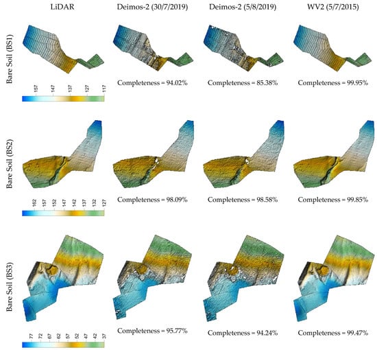 DSMs and completeness values corresponding to the three subareas of bare soil land cover (BS1, BS2 and BS3) generated from the first and second Deimos-2 stereo pairs (second and third column) and the WV2 stereo pair (fourth column). The reference LiDAR is depicted in the first column.