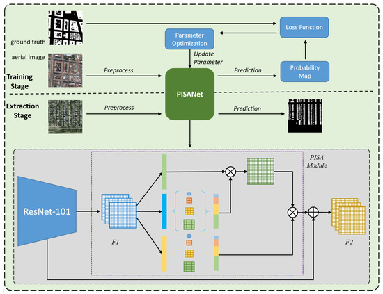 The flowchart of the proposed method and structure of the Pyramid Self-Attention Network (PISANet). The flowchart is divided into training stage and extraction stage. In the training stage, the input is a remote sensing image and corresponding label, and the output is a probability map. In the extraction stage, the input is a remote sensing image, and the output is the extraction result of the building.