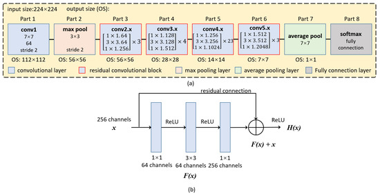 Figure 2a is the network structure diagram of ResNet-101, which can be divided into 8 parts, including 5 structures. The first part is a convolution layer. The convolution kernel size of the input image is 7 × 7, and the stride is 2. In the process of learning features, the size of the feature map is halved from the input size 224 × 224 to the output size 112 × 112. The second part is the maximum pooling layer. The maximum value within the range of 3 × 3 pixels is taken as the output, and the size of the feature map is further halved to reduce the output size to 56 × 56. The third to sixth parts are residual convolution blocks, which are also the core of ResNet. This part mainly increases the depth of the network for further residual learning. The first residual convolution block does not change the size of the output feature map, and the size of the output feature map for the other three blocks is halved. The seventh part is the average pooling layer. The average value within the range of 7 × 7 pixels is taken as the output. The eighth part is the full connection layer composed of 1000 neurons, corresponding to 1000 categories. The output is the probability of the input image for the 1000 categories. The category with the highest probability is the final output class.