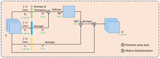 To retain spatial information as much as possible and effectively reduce the amount of calculation and GPU memory usage, the key is to reduce the size of the attention map generated in non-local, while obtaining dense context information. This can be achieved by simply changing the number of pixels in each channel in the K and V branches [31]. As shown in Figure 4, the size of the feature map Q” obtained in the Q branch is N × C, and the size of the feature map K” obtained in the K branch is C × S. After matrix multiplication of Q” and K”, the feature map QK” with size N × S is obtained, and the size of feature map QKV” after matrix multiplication of QK” and V” is N × C, which is the same as QKV’ in Figure 3. At this time, as long as the condition of S << N is satisfied, the computational complexity can be reduced to O(CNS), which is significantly lower than the complexity O(CN2) of the original self-attention. The calculation includes the following two processes: