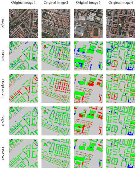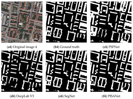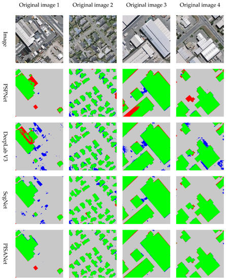 In order to qualitatively show the accuracy of the results, the predicted results are displayed in color (Figure 7). The green part is true positive, the gray part is true negative, the blue part is false positive and the red part is false negative. When the extraction performs well, the green (true positive) and gray (true negative) are the majority, but the blue (false positive) and red (false negative) are minority. Red (false negative) indicates missing building information, and blue (false positive) indicates incorrect building information. From Figure 7, it can see that red and blue are less in PISANet than in the results of the other three methods, indicating a better performance. PISANet is also slightly better than the other methods at discriminating non-buildings (the blue part is less). Due to certain errors in the ground truth, some buildings are represented by non-buildings on the ground-truth label, but the predicted result is considered to be buildings, which leads to more blue areas (the building in the lower right corner of original image 4 is a non-building in the ground truth label).